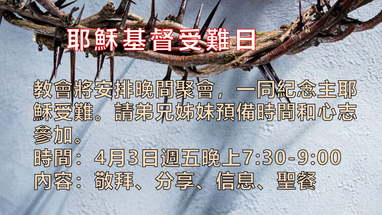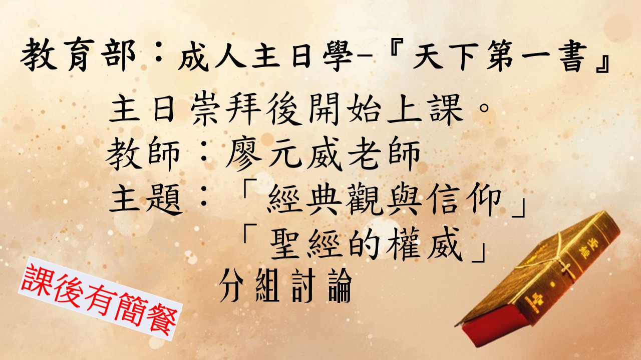 3月22日主日崇拜後(約上午11:45 )開始上課